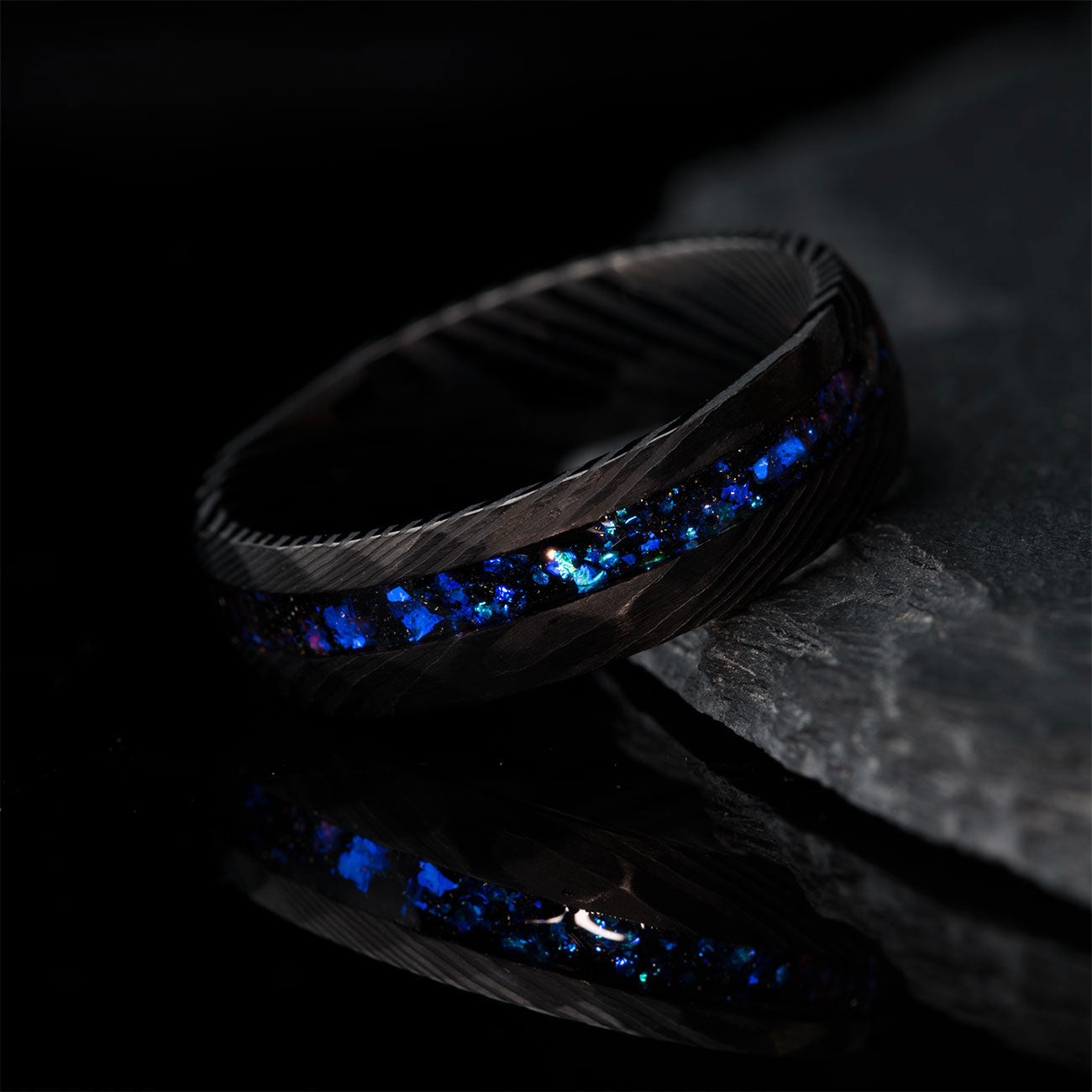 No two rings are ever the same — the combination of natural gemstone and patterned Damascus steel ensures that THE BLUE PHANTOM SHADOW is as unique as the story you choose to wear.