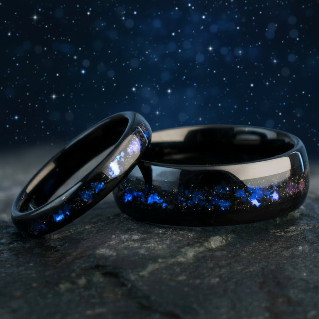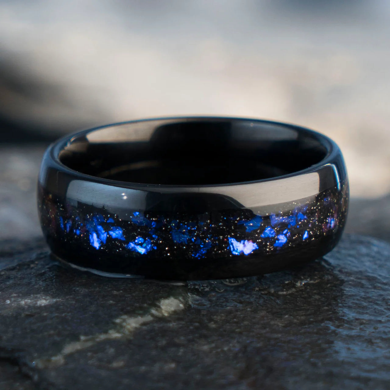 The color-shifting blue-violet alexandrite in TWILIGHT ORACLE glows like nebula clouds drifting through a sea of stars. Each movement of light reveals a new tone, creating a living, cosmic effect on your hand. This black tungsten carbide ring stands apart from traditional wedding bands — bold, modern, and unmistakably unique.