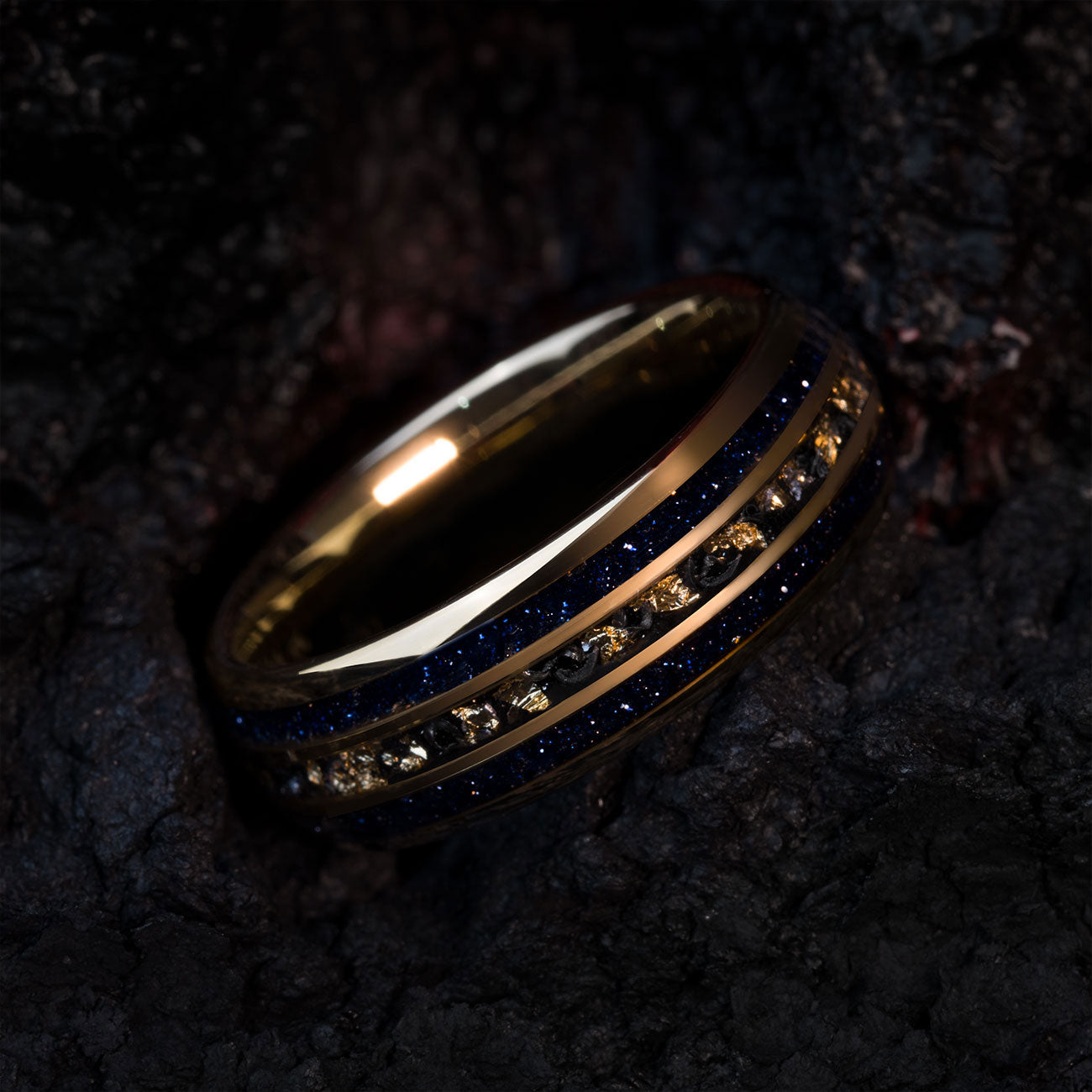 THE WISDOM SPIRIT is a luxury wedding band, combining gold tungsten, meteorite, 22k gold leaf, and star sand. Each component brings a unique touch of elegance and a subtle connection to the Spirit of Wisdom. With this ring on your finger, you’ll command admiration and respect for your style and taste.