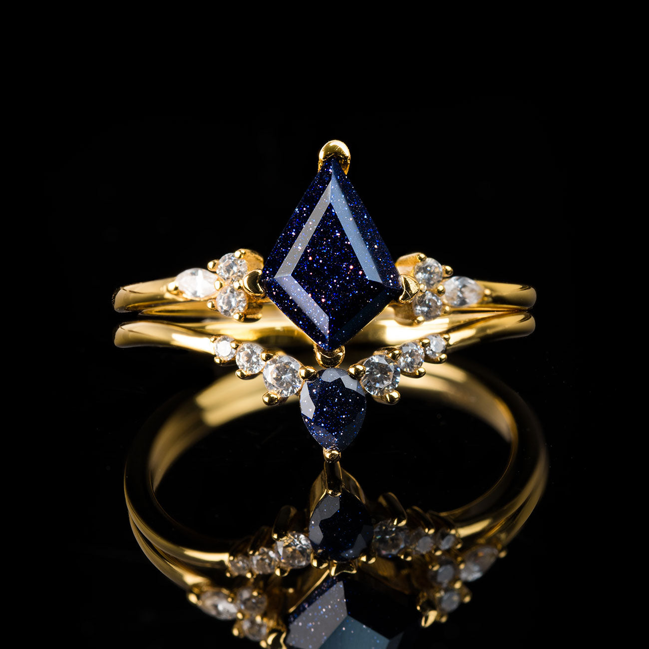 Expertly crafted for elegance and durability, this women's ring features a stunning blue star sand gemstone and our signature claw setting. Two separate gold rings, adorned with pear-shaped black zircon and sparkling white diamonds, add sophistication and luxury, making it the perfect choice for contemporary brides.